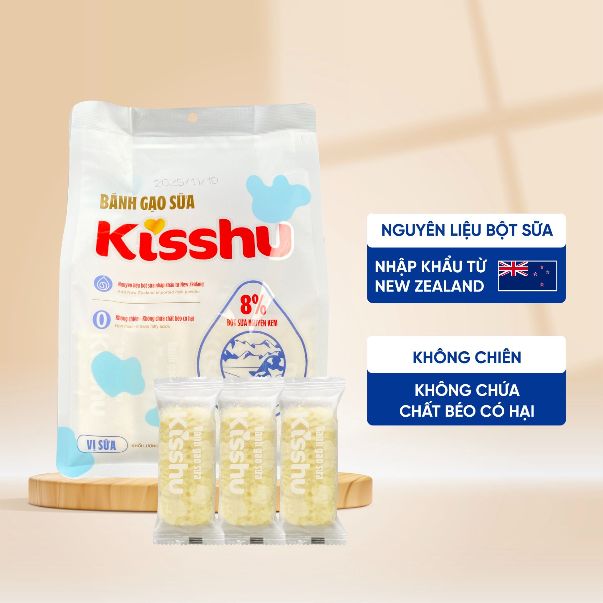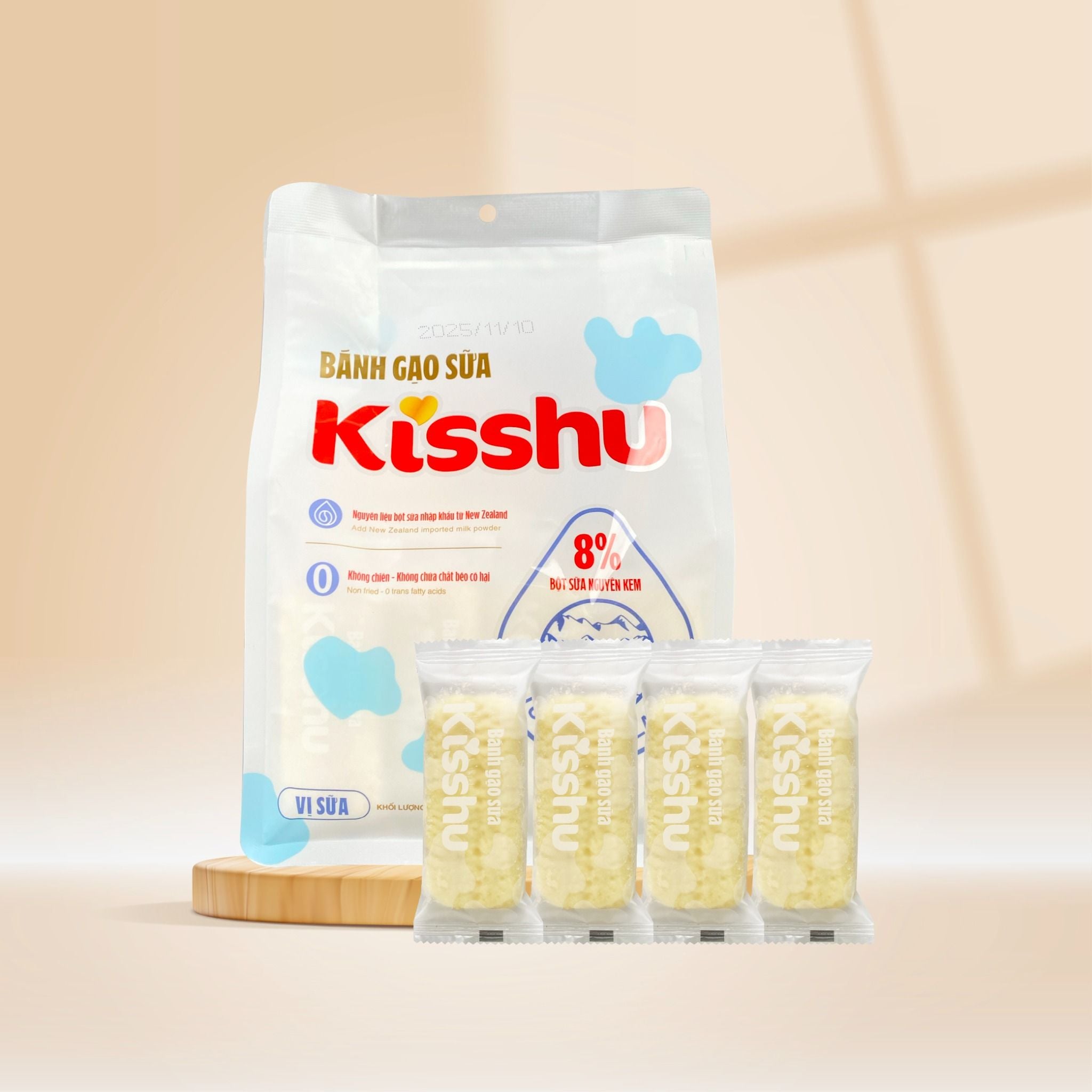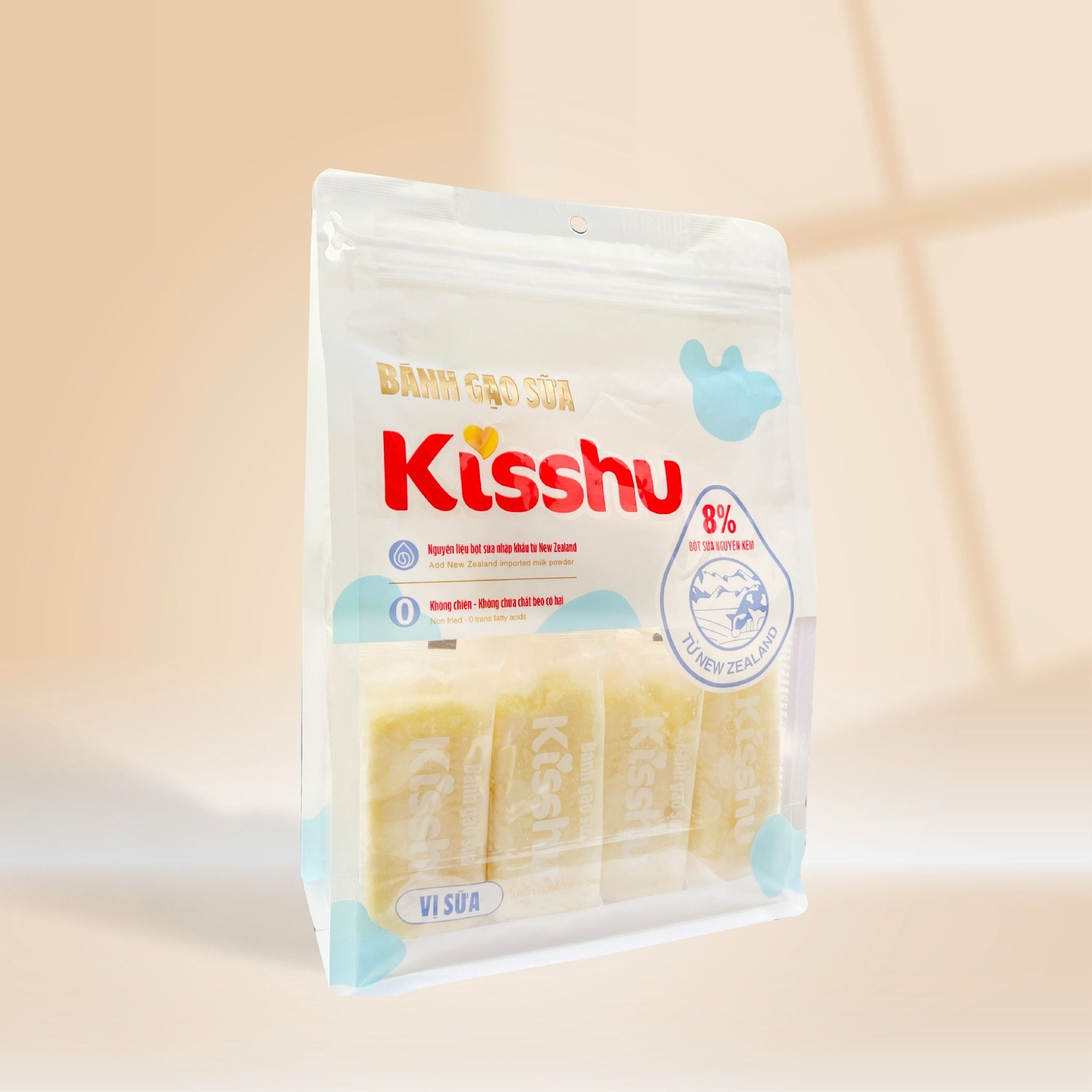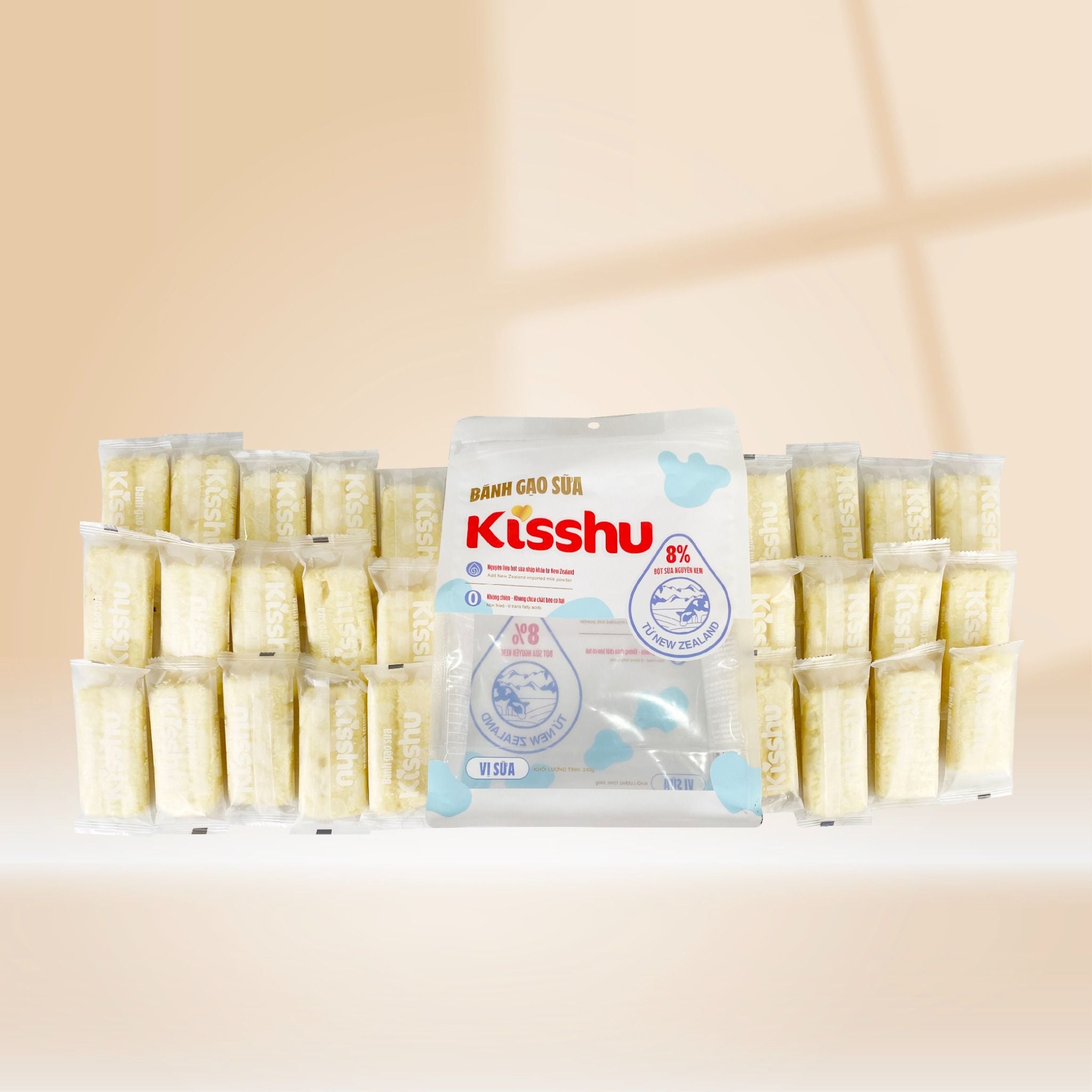 Bánh gạo sữa Kisshu cung cấp năng lượng nhanh, có tinh bột gạo, protein và vị sữa tự nhiên, phù hợp dùng hằng ngày cho cả gia đình.