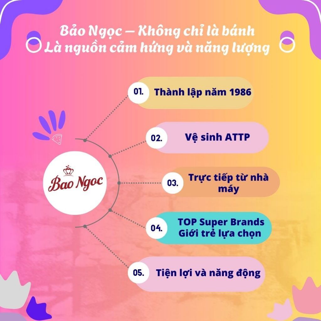 Công ty Cổ phần Đầu tư Tập đoàn Bảo Ngọc, được thành lập từ năm 1986, đã và đang là một trong những thương hiệu uy tín trong ngành sản xuất thực phẩm tại Việt Nam. Với sứ mệnh mang đến những sản phẩm chất lượng cao, sản phẩm được cải tiến phù hợp với giới trẻ: “Bảo Ngọc không chỉ là bánh mà còn là nguồn cảm hứng và năng lượng ”